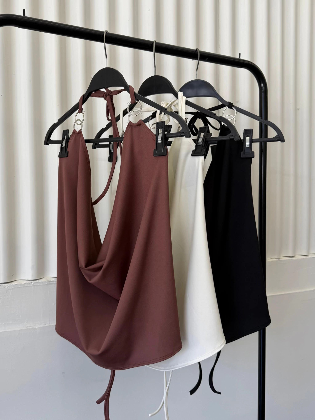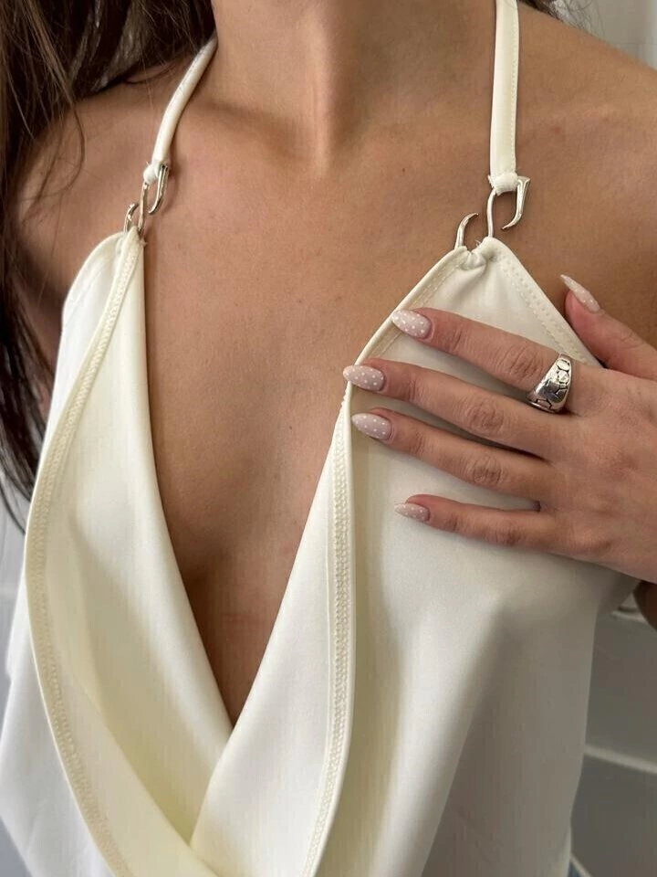 Top -estilo pechera- con un elegante escote buche que aporta caída suave y un look sensual. Presenta apliques metálicos en la parte superior que conectan los tirantes y añaden un detalle moderno y llamativo. Se ajusta con lazos tanto en el cuello como en la espalda, permitiendo adaptarlo a la medida y garantizar un calce cómodo y favorecedor. Talle único.