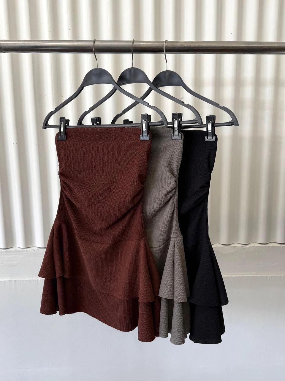 Vestido strapless. Confeccionado en bambula. Escote elegante y versátil. La pollera esta estructurada en dos capas que añaden volumen y movimiento, realzando la silueta. Talle único.